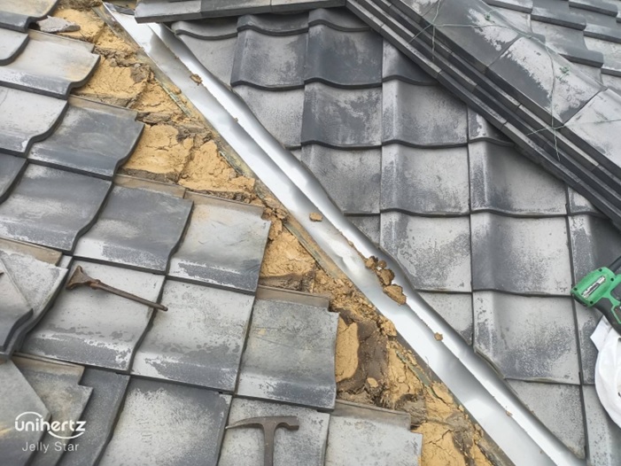 谷の左右の瓦をめくり、新品のステンレス製の谷板を設置します。