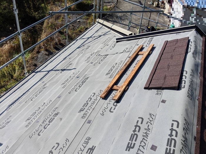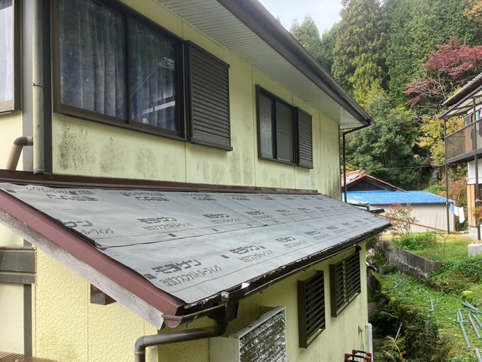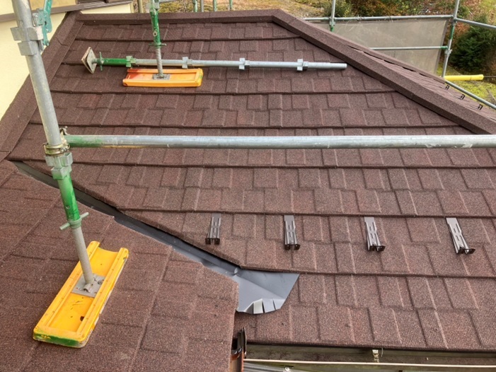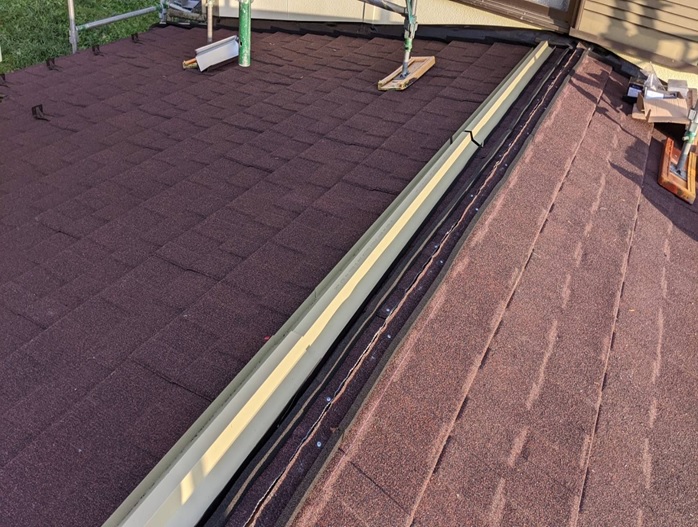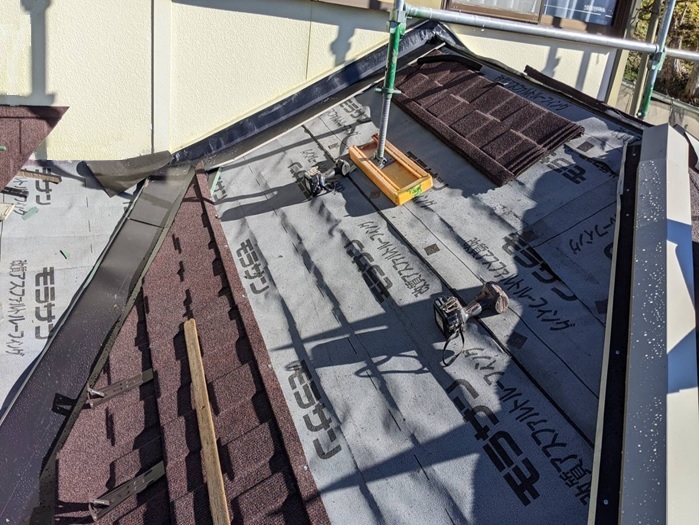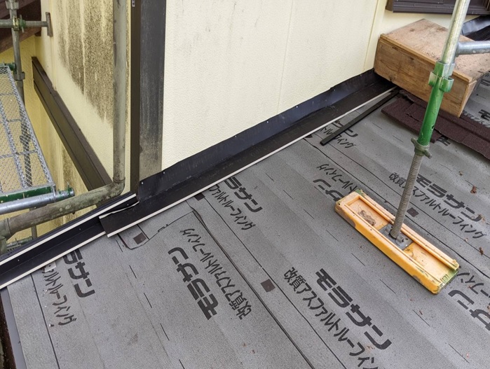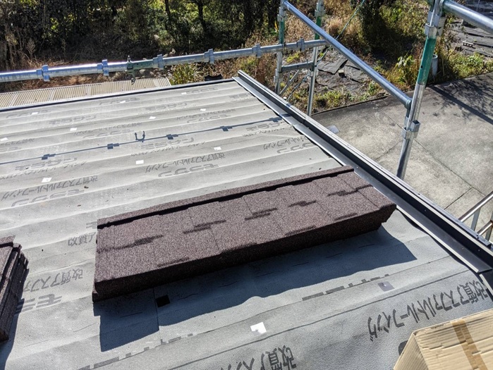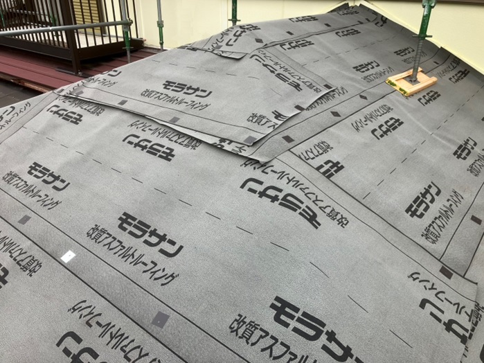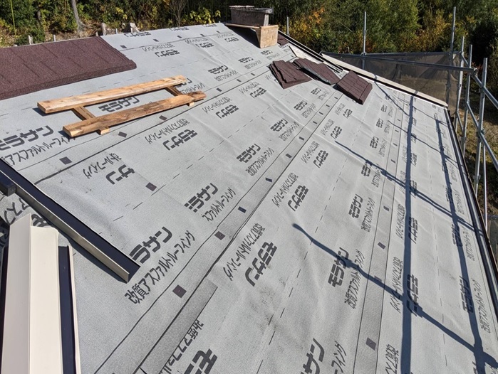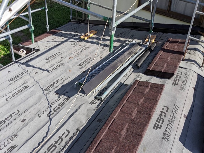 カバー工法とは、既存のカラーベスト(屋根材)をめくらず、その上に防水シートを施工し、その上に石付板金ヴィクセンを施工する工法です。