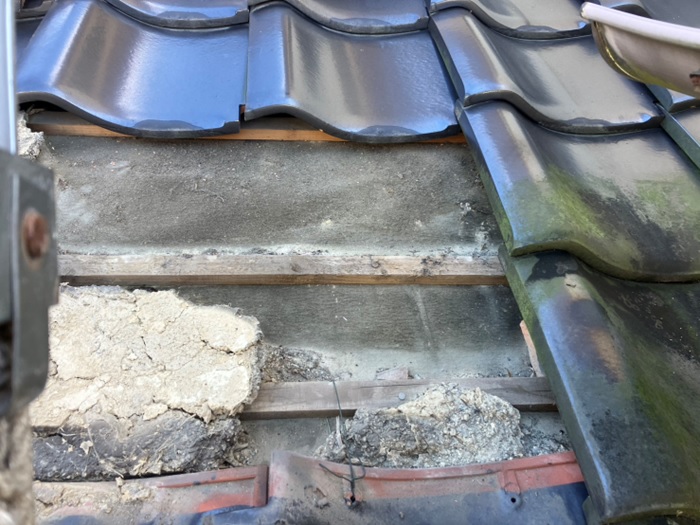 まずは一番の不安の種だった、玄関上の瓦の点検と補修です。
