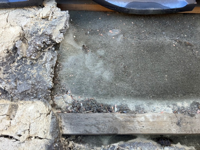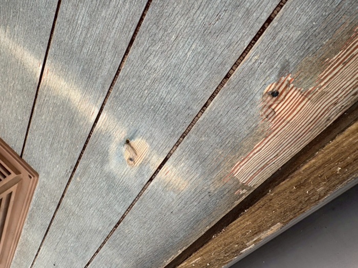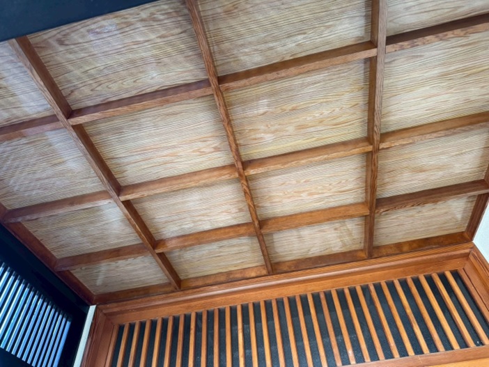 瓦の下の野地板には湿ったような跡がありますが、玄関の天井裏板にはシミがなくて良かったです。