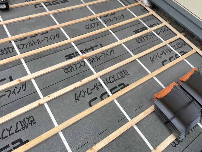 防水シートを敷き、縦桟テープ・瓦桟木を施工します。