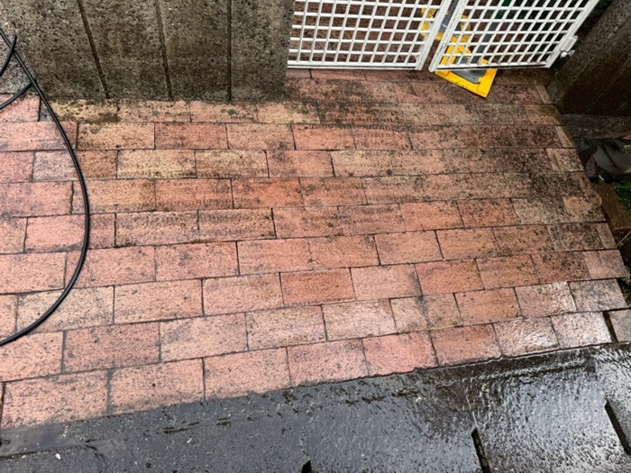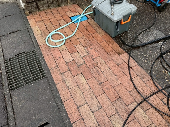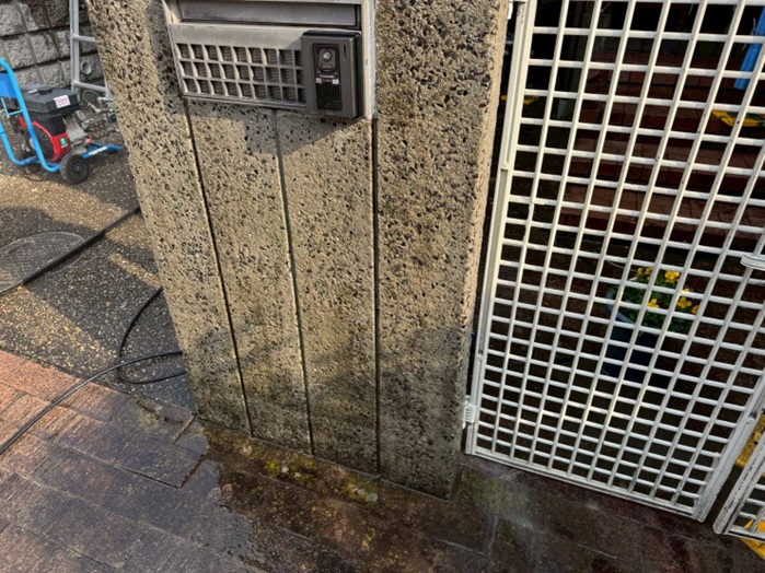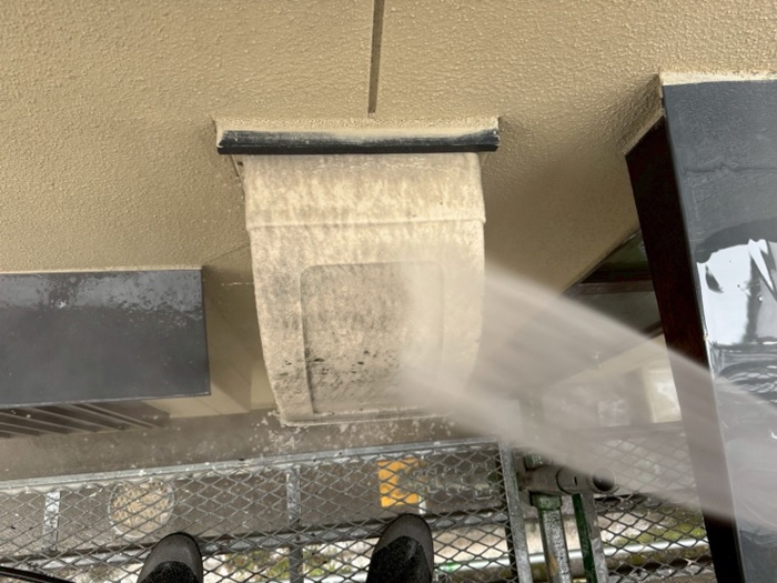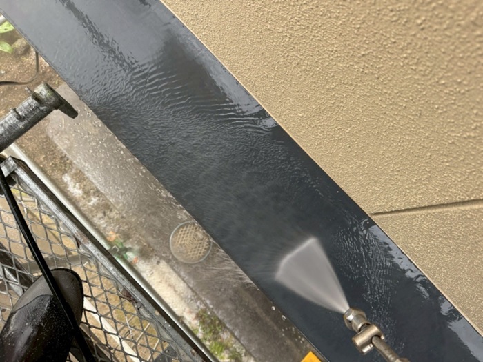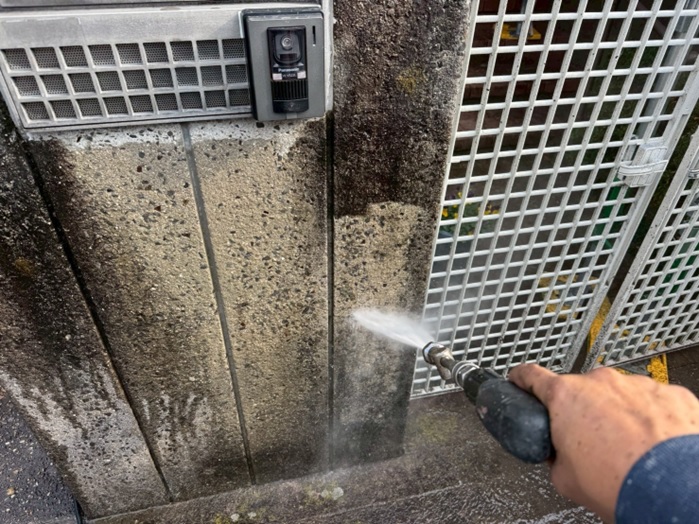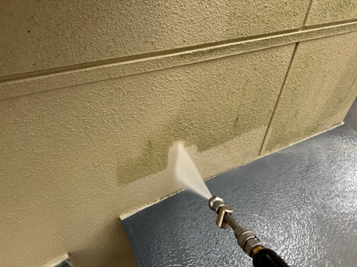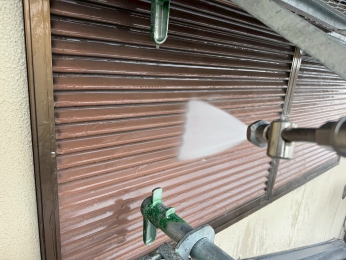 2. 外壁塗装工事。高圧洗浄で汚れをリセット。