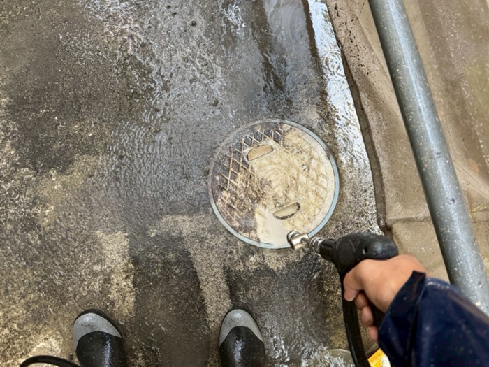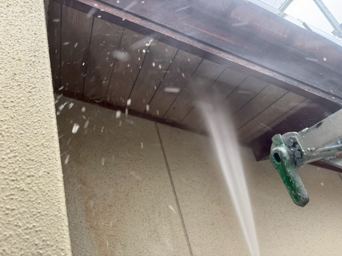 続いて、お家全体の汚れを強力な水圧で洗い流します。古い汚れを落とし切ることで、この後塗るペンキの「持ち」が劇的に変わります。