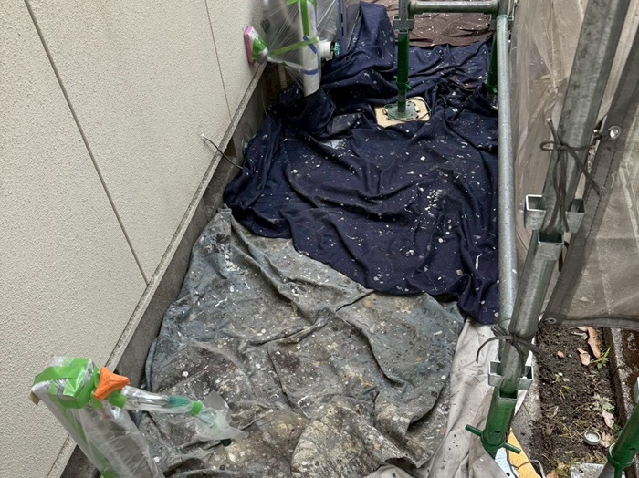 塗装工事が始まる前に、家回りの通路・ベランダに古布を敷いて汚れるのを防いでいます。