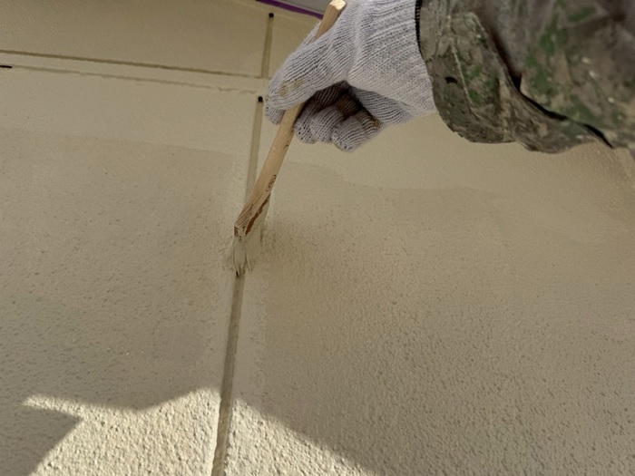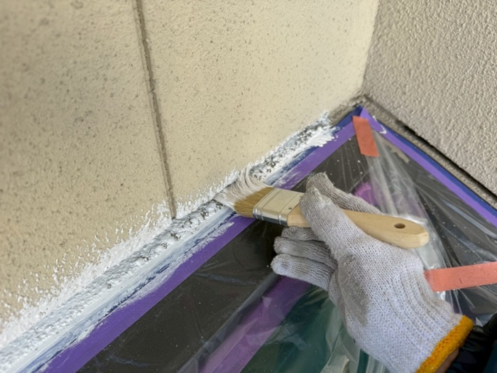 ・ 接着剤(プライマー)を塗る 「プライマー」という専用の接着剤をハケで丁寧に塗ります。これがあることで、後から入れるゴム材が壁にピッタリ吸い付き、剥がれにくくなります。