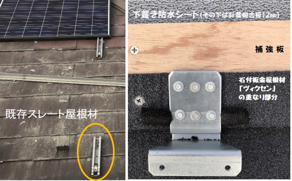 既存のスレート屋根に太陽光が設置してあった時は、屋根材に穴を開け金具(写真左黄色〇)を取り付けてありました。屋根材に穴を開けるということは、その穴から雨水が入り雨漏りの原因となります。