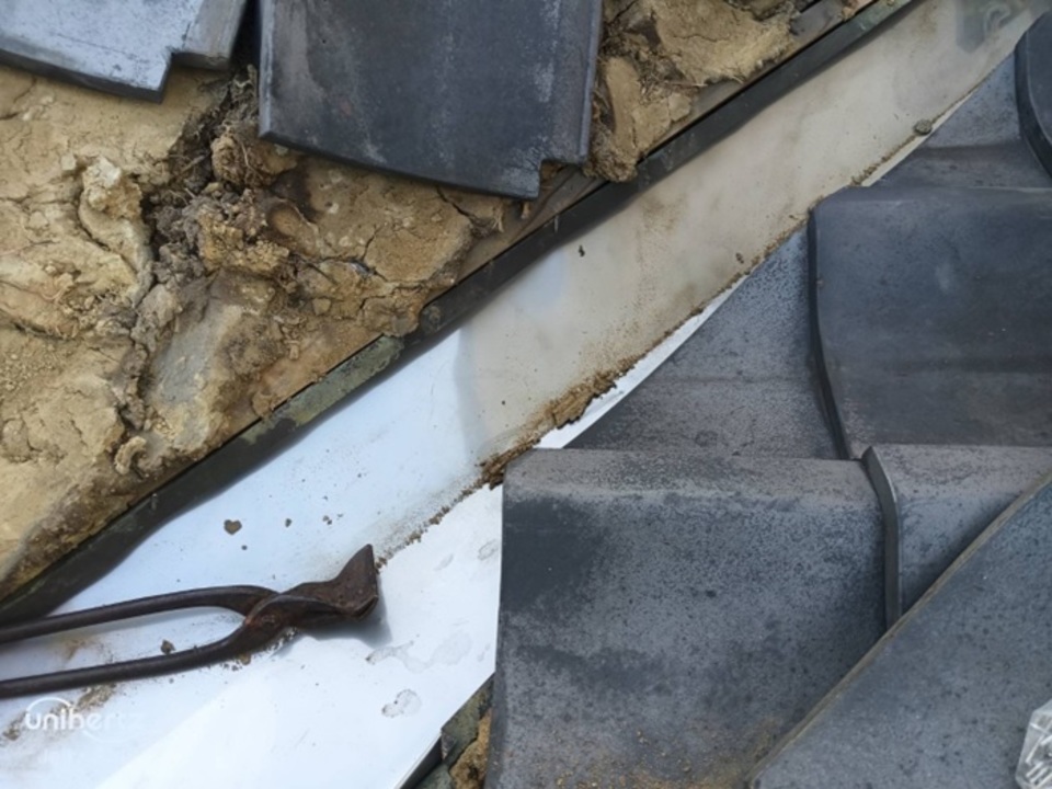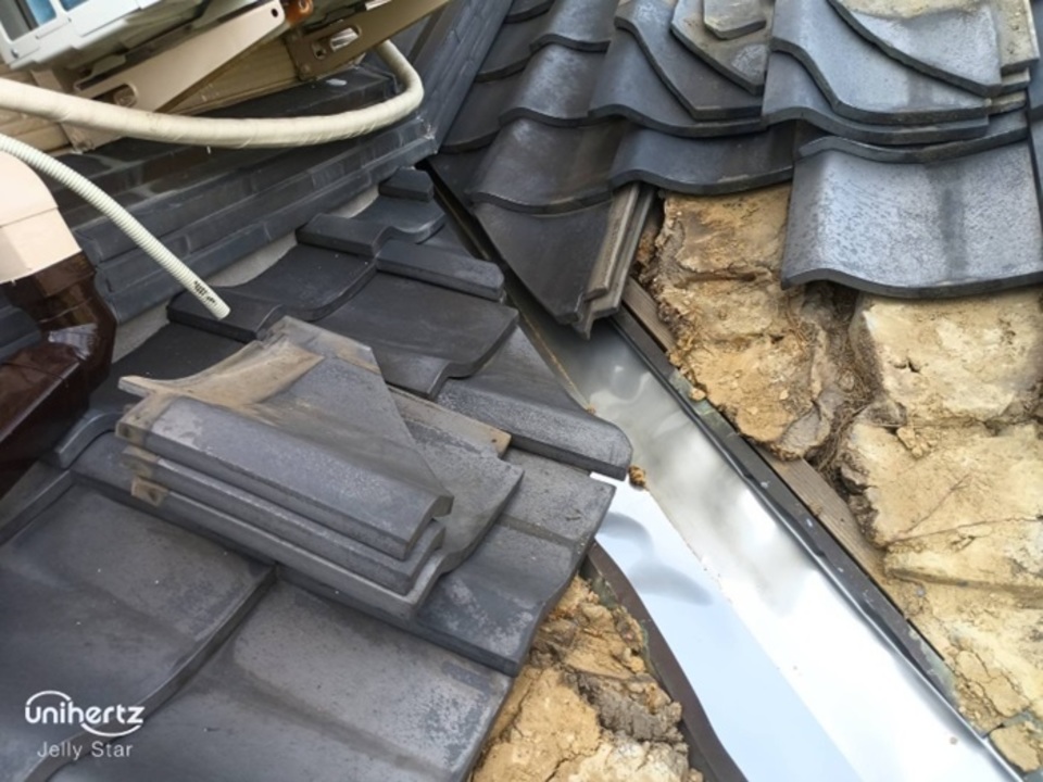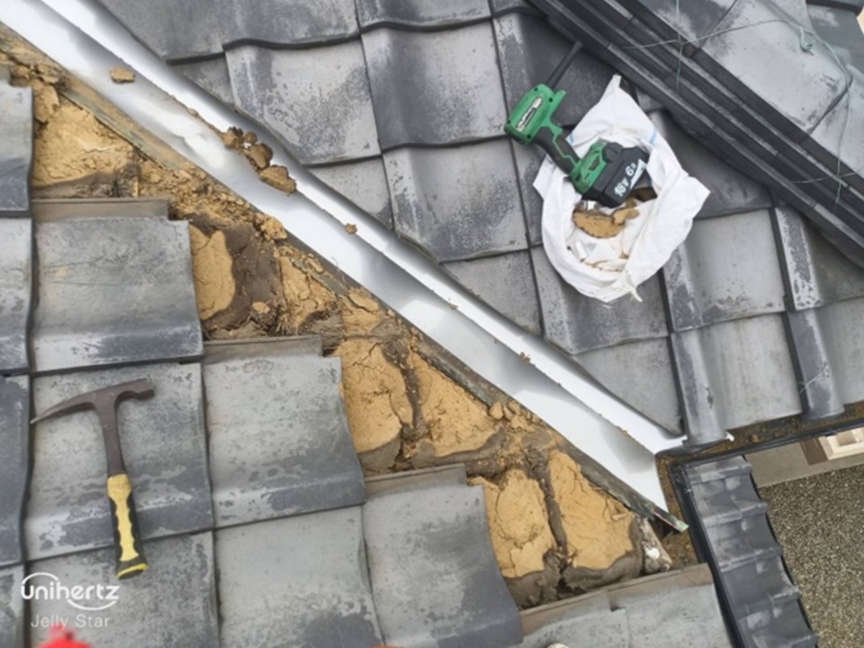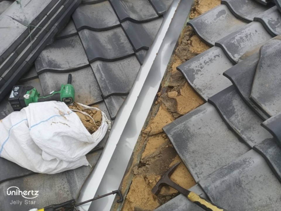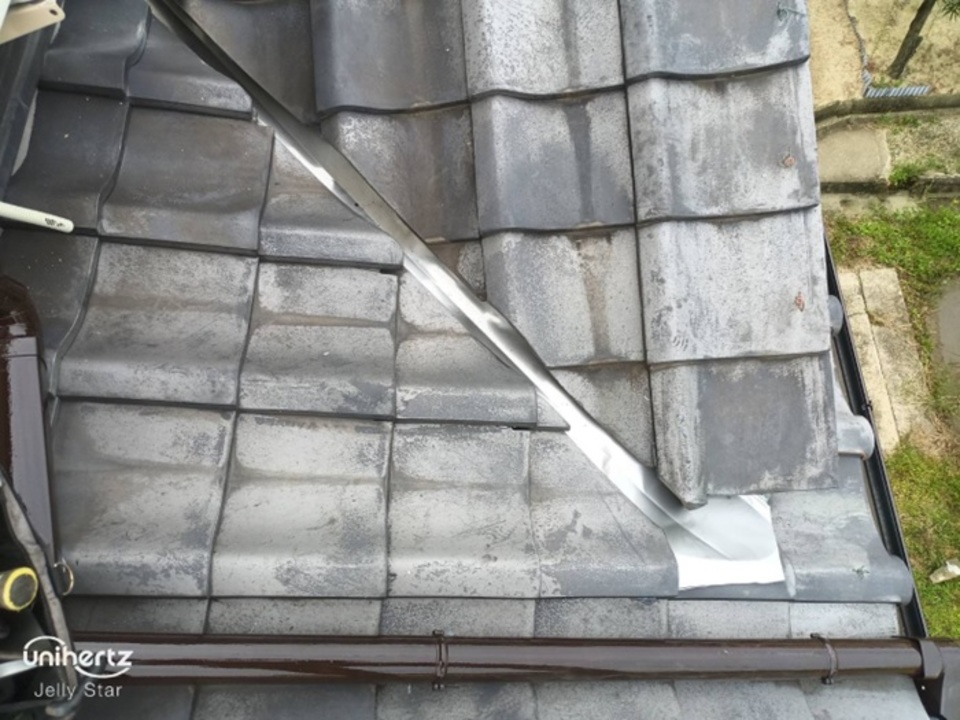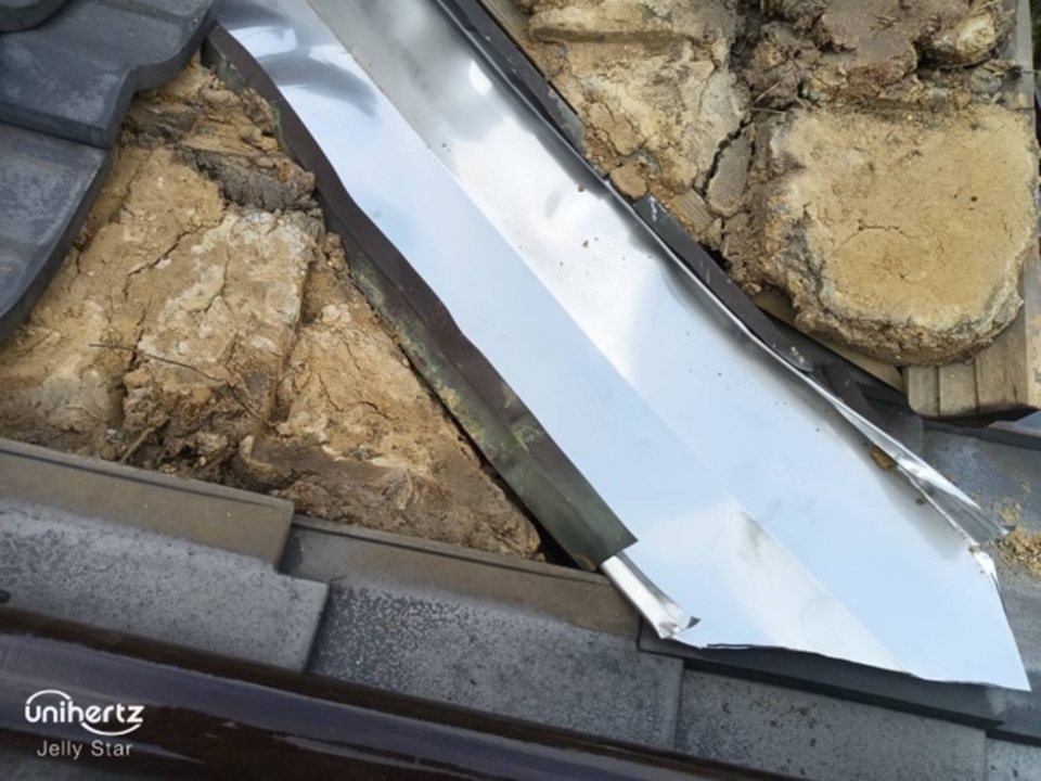 谷の左右の瓦をめくり、新品のステンレス製の谷板を設置します。